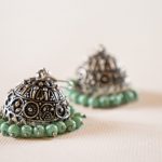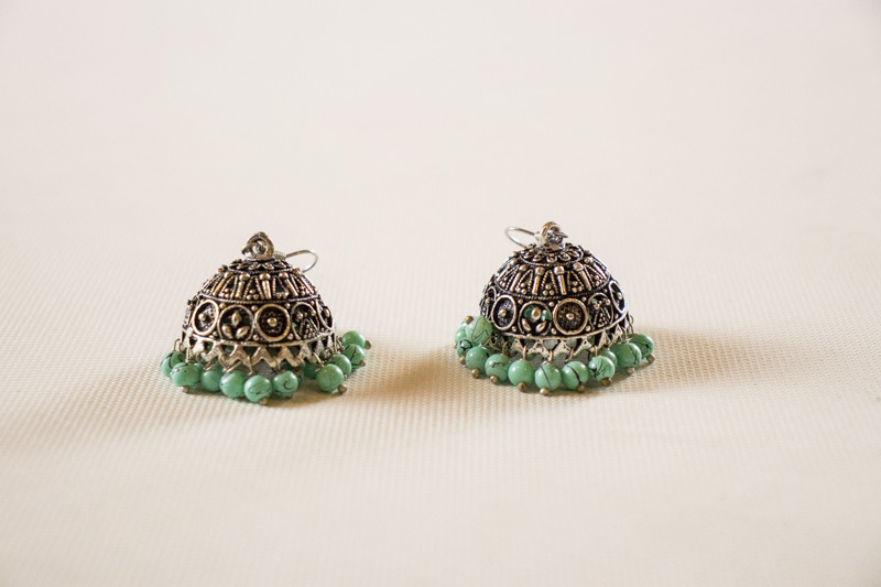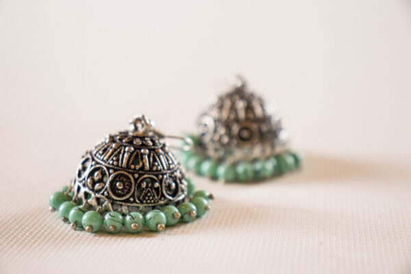 Ezüstözött fülbevaló zöld üveggyöngy díszítéssel