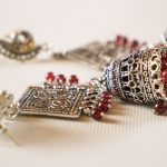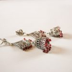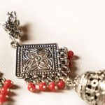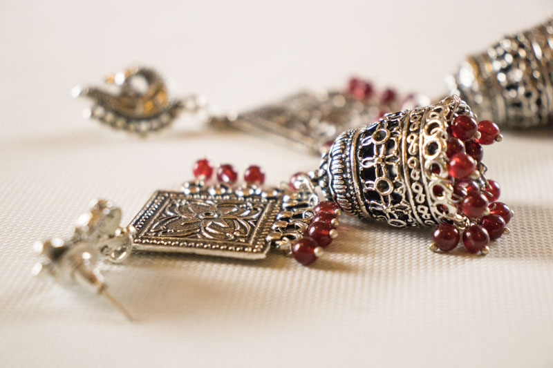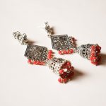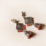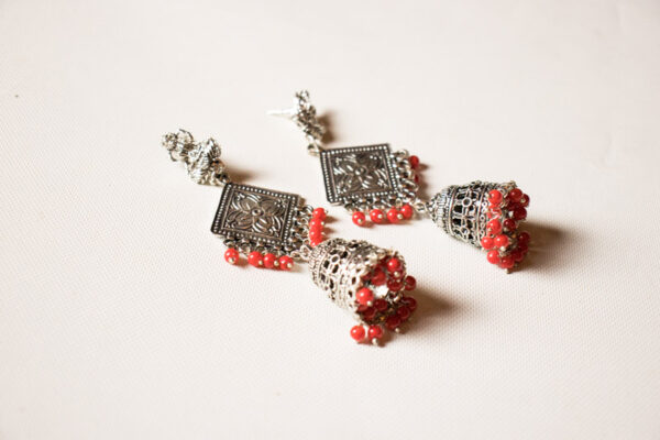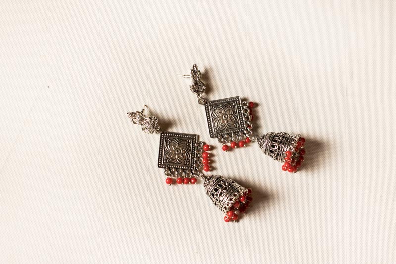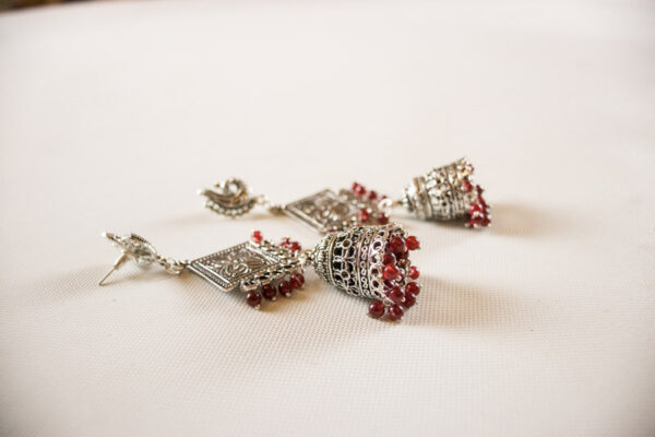 Igényes megmunkálású nagy lógó fülbevaló. Az anyaga sárgaréz, melyet ezüstöztek. A díszítése a míves dizájn mellett sötétpiros üveggyöngyökkel történt.